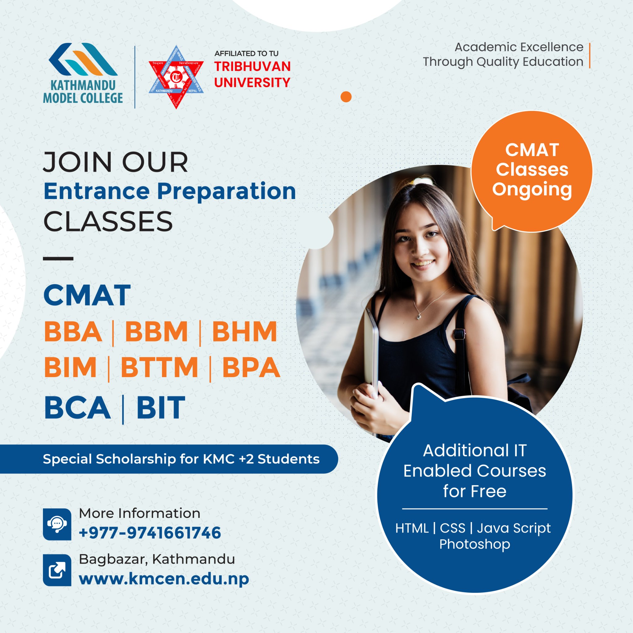 Special Scholarship for KMC +2 Students Additional IT Enabled Courses for FreeHTML | CSS | Java Script | Photoshop For more information, please contact:+977-9741661746Bagbazar, Kathmandu KMC #CMAT #BCA #BITRead More