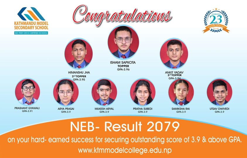 Congratulations to our students for their hard-earned success in NEB Result 2079, securing 3.9 and above GPA. Topper: Isham Sapkota (GPA-3.96) 2nd Topper: Himanshu Jha (GPA-3.95) 3rd Topper: Ankit Yadav (GPA-3.94) KMC Family is extremely proud of their achievement and would like to wish best of luck for their future endeavors! 𝐴𝑐𝑎𝑑𝑒𝑚𝑖𝑐 𝐸𝑥𝑐𝑒𝑙𝑙𝑒𝑛𝑐𝑒 𝑇ℎ𝑟𝑜𝑢𝑔ℎ 𝑄𝑢𝑎𝑙𝑖𝑡𝑦...Read More