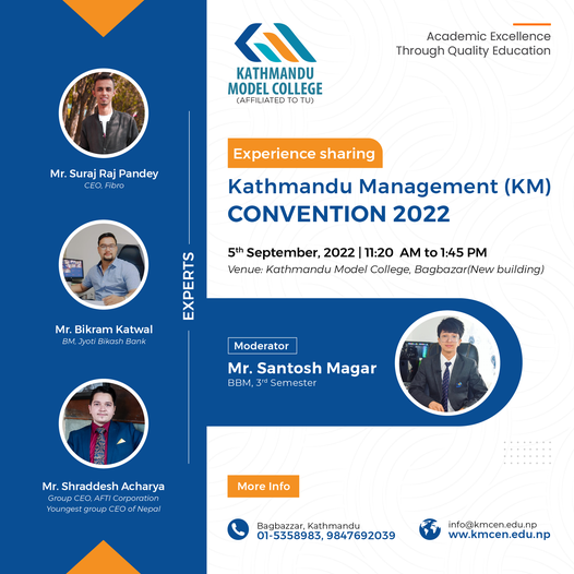 Following the success of last year’s event, Kathmandu Model College is back with Kathmandu Model Convention 2022. The highly experienced speakers will educate, inspire, and spark the student’s curiosity and provide them with the right direction as per their interests.The event is designed exclusively for +2 graduates to help them clarify their confusion, explore the...Read More